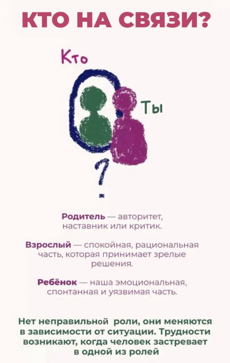 🔄 Например, на работе нам нужен Взрослый, чтобы принимать решения и планировать. В кругу друзей — Ребёнок, чтобы веселиться и быть креативным. А дома Родитель помогает заботиться о близких и поддерживать порядок.