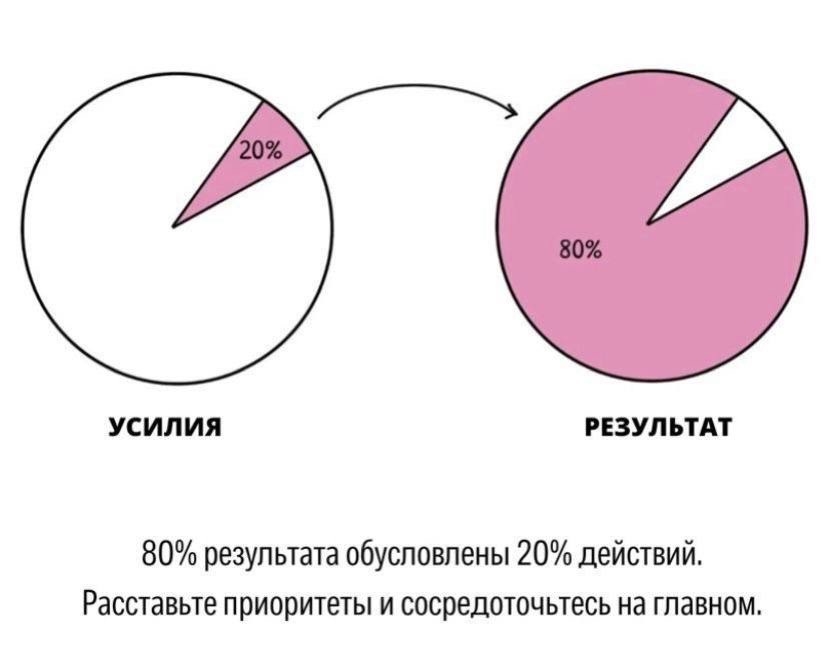 Согласно закону Парето, 80% результата достигается благодаря всего лишь 20% усилий. В контексте личностного роста это означает, что сосредоточившись на ключевых аспектах, вы можете добиться впечатляющих результатов!